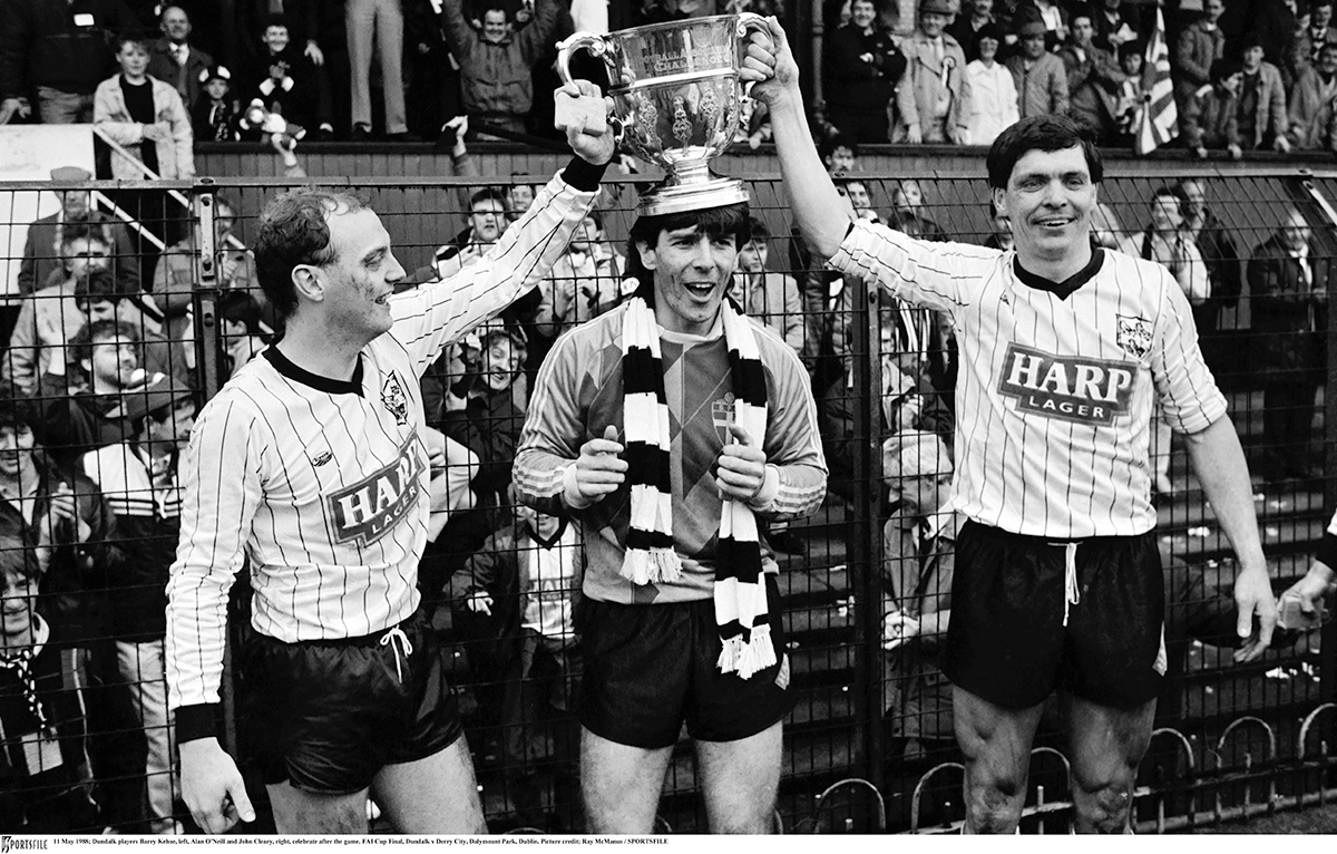 Dundalk legend Tommy McConville lifts the FAI Cup in 1977.