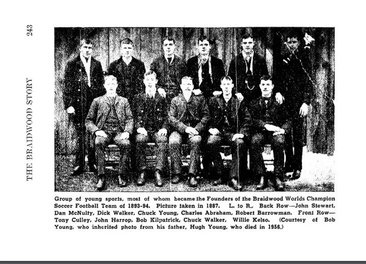 In Illinois, before Gillespie became a soccer playing and mining community, players of Scottish descent had competed in coal mining communities near the northern Illinois city of Chicago. Braidwood, Illinois, about 200 miles north of Gillespie and 60 miles from Chicago, was one of those soccer playing and mining communities. Chicago soccer leagues in the late 1880’s and 1890’s regularly included competitive Braidwood teams. In an 1894 international match versus Toronto Thistles, Braidwood defeated the Canadians 7-1, and the Illinois team included one Belgian player, one native born USA player (the goalkeeper Robert Barrowman, who was also of Scottish decent), and nine Scottish immigrants.