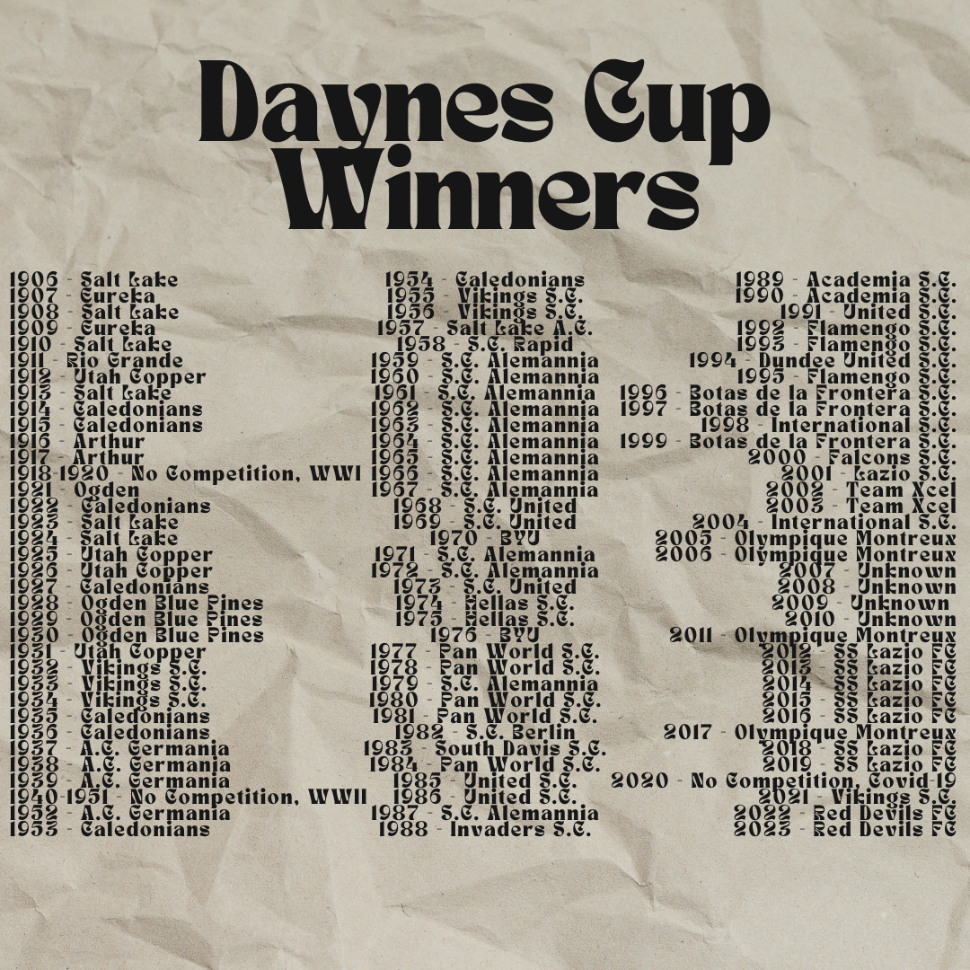 Since the 2000’s, the Daynes Cup has been won by local Salt Lake teams in the Utah Adult Soccer Association Premier Division (with the exception of Clearfield High School winning in 2000). Those teams are Olympique Montreux, SS Lazio FC, Vikings SC and Red Devils FC.