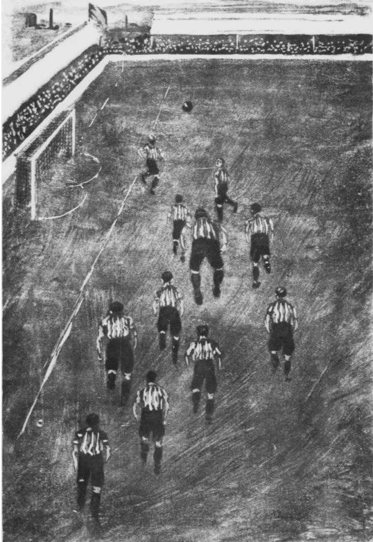 Its importance also lies in the fact that, despite the rapidly increasing popularity of football in the late 19th century, it is a subject that was largely ignored by fine artists. Indeed, according to sports historian Ray Physick (who wrote a fascinating PhD on the subject of representations of football in art), it was not until 1992 and the dawn of the Premier League that football came to be considered to be a suitable subject for art. This, of course, is a bit of a generalisation and Physick points to the work of L. S. Lowry, Paul Nash, C. R. W. Nevinson, Sybil Andrews, Carel Weight, Cecil Beaton, Nigel Henderson, and Peter Blake as exceptions to this rule.